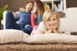 Portrait,Of,Smiling,Girl,Relaxing,On,Carpet,In,Living,Room