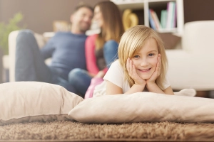 Portrait,Of,Smiling,Girl,Relaxing,On,Carpet,In,Living,Room